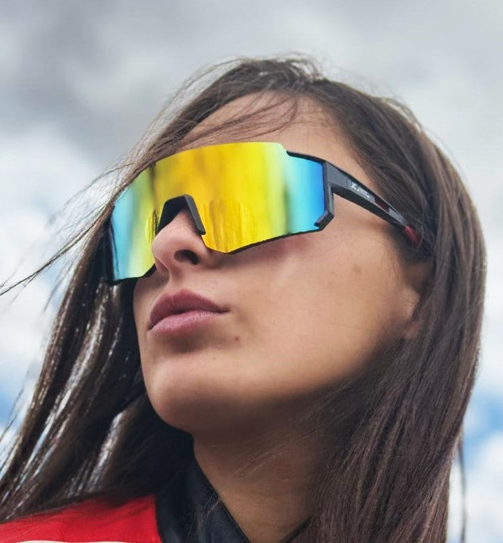 Il trattamento multistrato della lente crea un effetto specchiato multicolore che cambia sfumatura a seconda della luce: dal blu al viola, dall'oro al verde, per un look che unisce performance e stile.