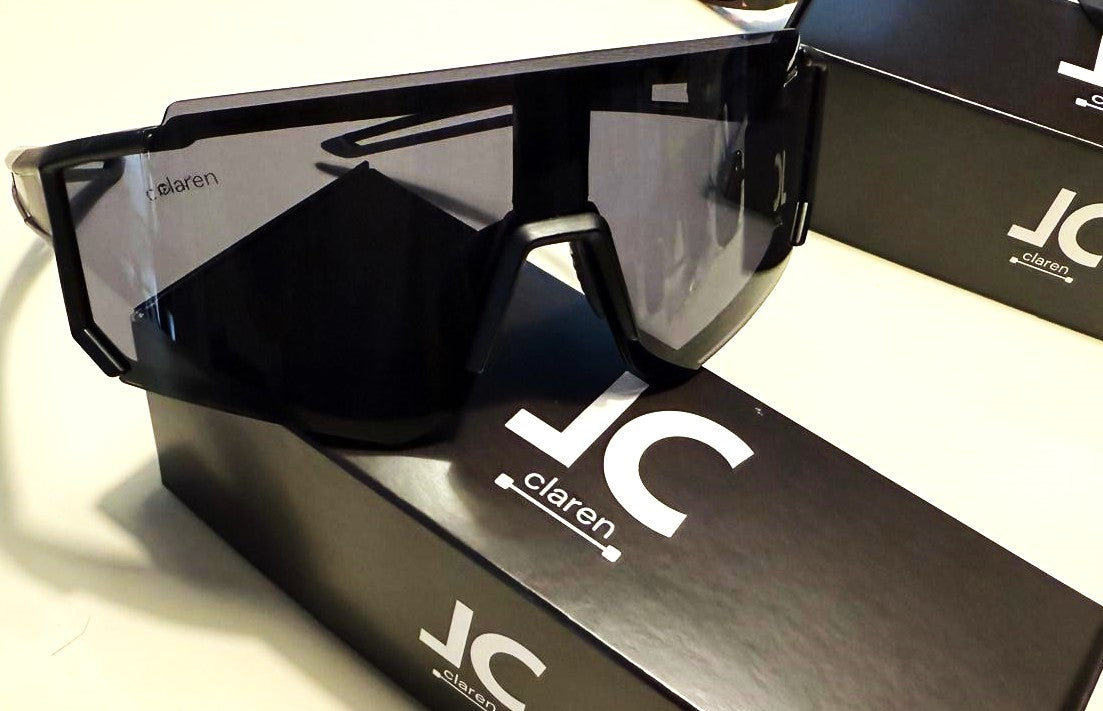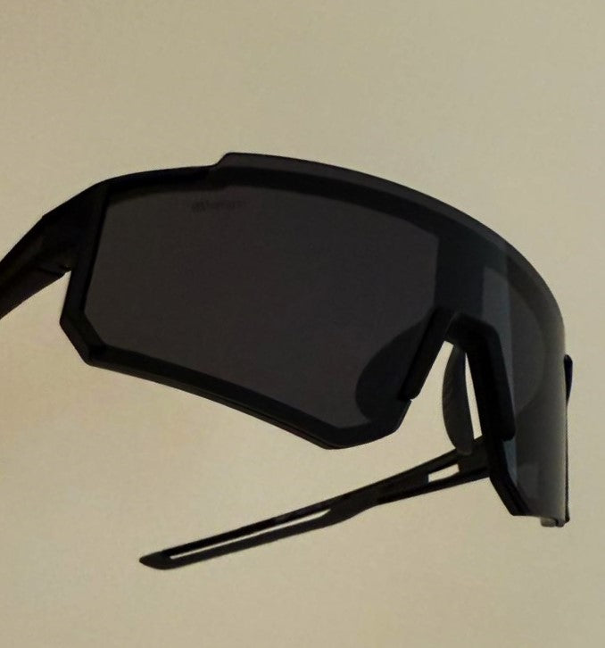 La montatura full black opaca, leggera e flessibile, si fonde con la lente nera, creando una linea continua, aerodinamica, che taglia lo spazio con precisione.